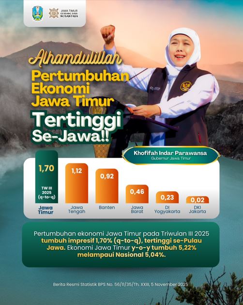 Pertumbuhan ekonomi Jatim itu juga di atas pertumbuhan ekonomi secara nasional. BPS mencatat pertumbuhan ekonomi nasional yang secara (q-to-q) terhadap kuartal II 2025 adalah 1,43%, sementara secara (y-on-y) tumbuh 5,04%.