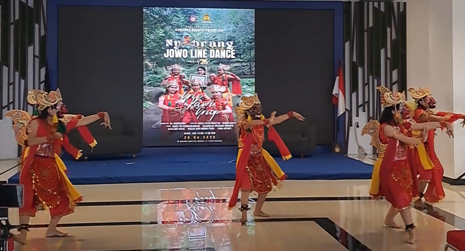 Ibu-Ibu Jowo Line Dance itu juga berkolaborasi dengan para penari yang lebih muda dari Kampung Budaya Polowijen (KBP) mempersembahkan Tari Topeng Malangan sebagai pembuka dan penutup acara.