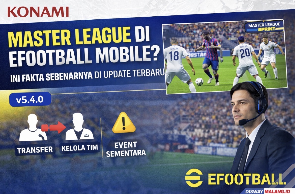 MALANG, DISWAYMALANG.ID– Kabar gembira datang bagi penggemar game sepak bola mobile. Konami akhirnya menghadirkan nuansa Master League di eFootball Mobile melalui pembaruan terbaru versi 5.4.0. Namun, fitur ini belum sepenuhnya seperti Master League klasik yang dikenal di era PES.