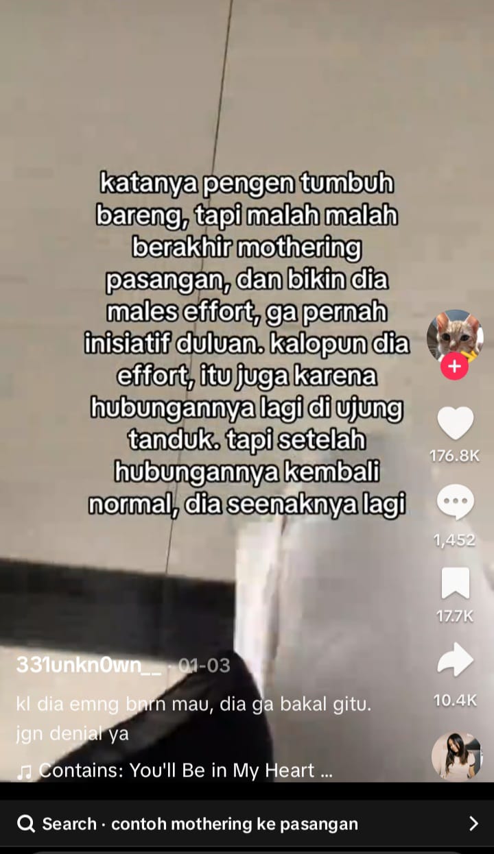 Fenomena ini sering muncul tanpa disadari, terutama dalam hubungan yang berkembang di fase usia dewasa muda. Banyak yang merasa “mothering” sebagai bentuk kepedulian, padahal dampaknya bisa merusak dinamika setara. Hubungan pun berubah menjadi relasi satu arah, dengan beban yang berat dipikul sendirian.