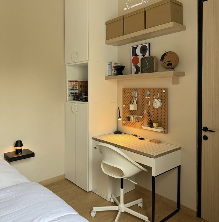 Tanaman kecil seperti sirih gading, kaktus mini, atau lidah mertua bisa mempercantik sekaligus menyegarkan udara. Tambahkan diffuser dengan aroma lemon atau lavender untuk suasana yang tenang dan fokus.