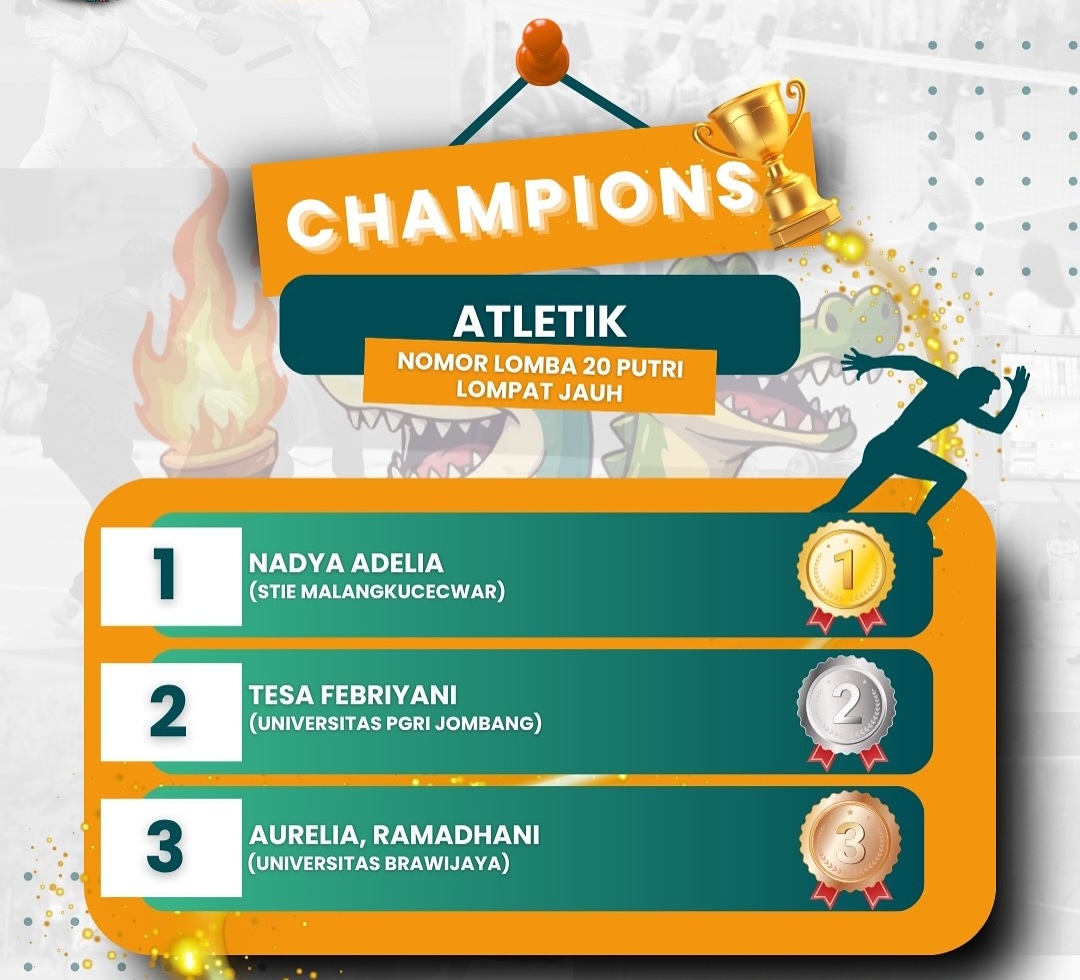Sedangkan STIE Malangkucecwara meraih emas dari nomor lompat jauh atas nama Nadya Adelia.