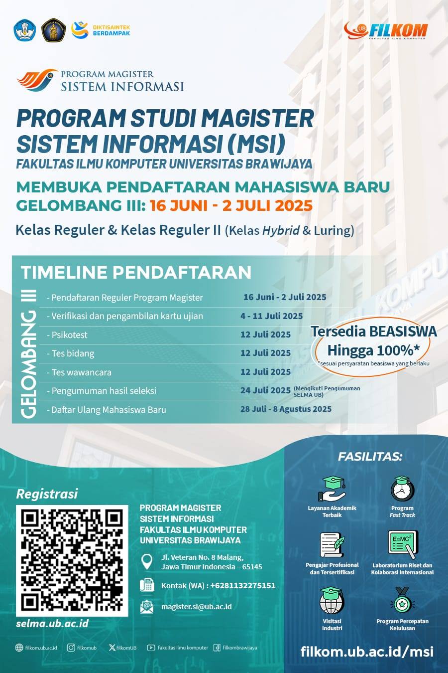 LOWOKWARU, DISWAYMALANG.ID--Fakultas Ilmu Komputer Universitas Brawijaya (FILKOM UB) membuka pendaftaran mahasiswa baru untuk Program Magister Sistem Informasi (MSI). Pendaftaran gelombamg 3 ini dibuka sampai 2 Juli 2025.