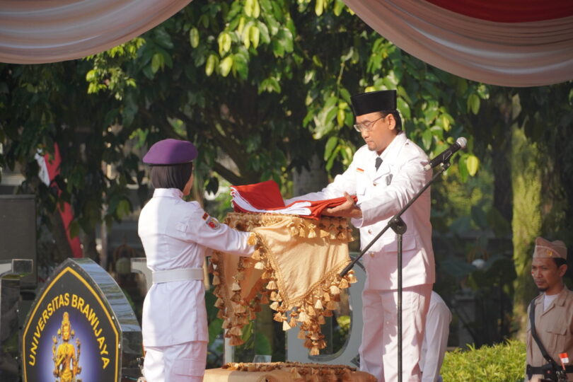 Rektor UB menyerahkan bendera Merah Putih untuk dikibarkan dalam Upacara Peringatan HUT ke-80 RI di Lapangan Rektorat UB. minggu (17/8)--prasetya.ub.ac.id