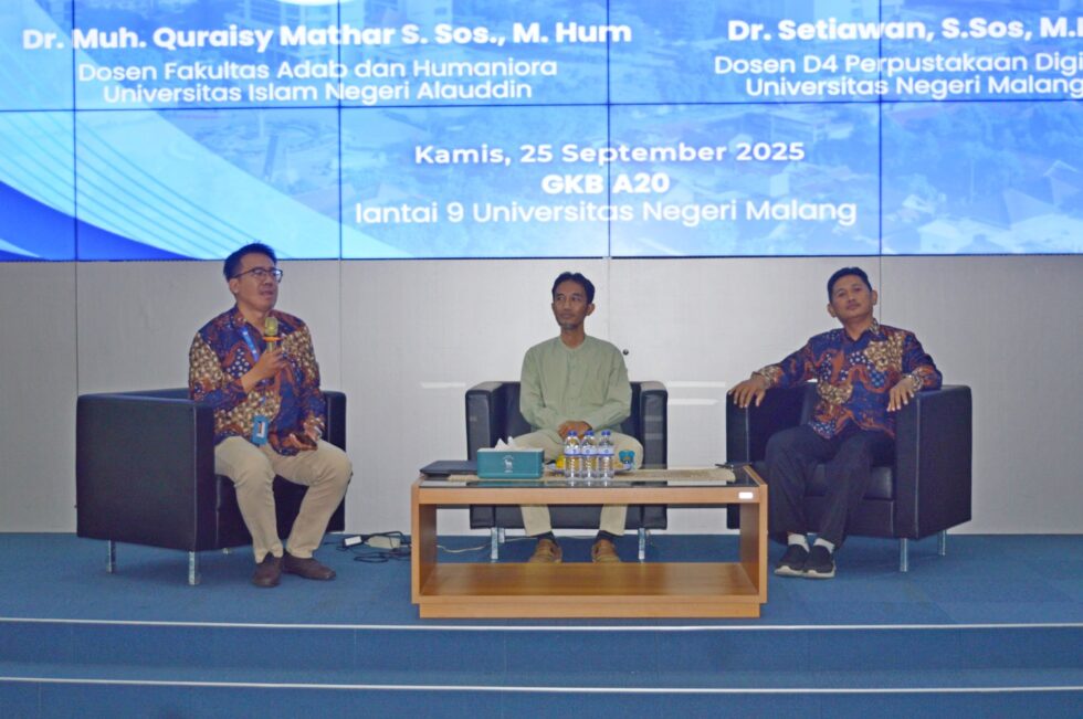 Kegiatan ilmiah tersebut menghadirkan dua narasumber utama, yakni Dr Muh Quraisy Mathar SSos MHum dari UIN Alauddin Makassar dan Dr Setiawan SSos MIP dari Fakultas Vokasi UM. Keduanya membahas berbagai inovasi dalam dunia perpustakaan digital. Diskusi dipandu oleh Adi Prasetyawan SSos MA, kemudian dilanjutkan dengan sesi presentasi makalah serta publikasi artikel ilmiah yang berhasil lolos seleksi.