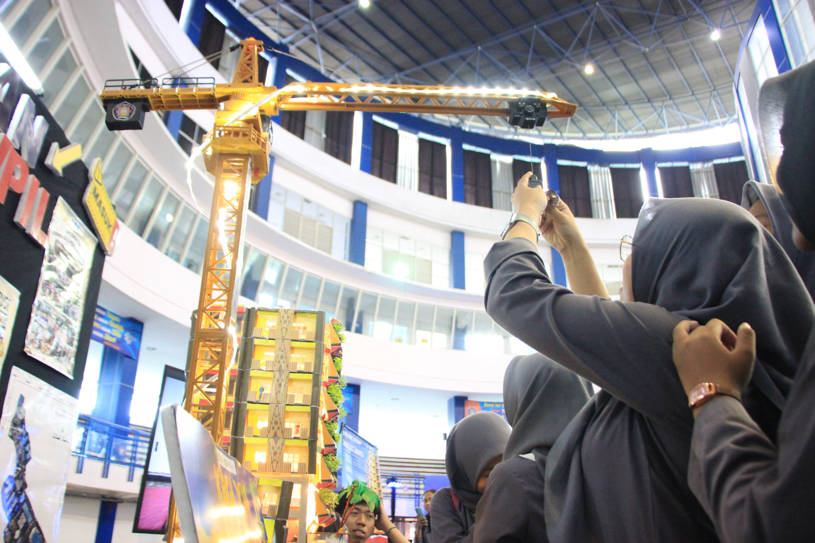 Pada booth mereka, tim juga menampilkan model crane sebagai elemen tambahan yang biasa ada dalam metode pelaksanaan gedung. Crane mini itu tidak digunakan untuk fungsi struktural utama, tetapi menjadi alat interaktif yang membuat pengunjung, terutama siswa SMA/SMK, lebih mudah memahami alur pelaksanaan konstruksi.