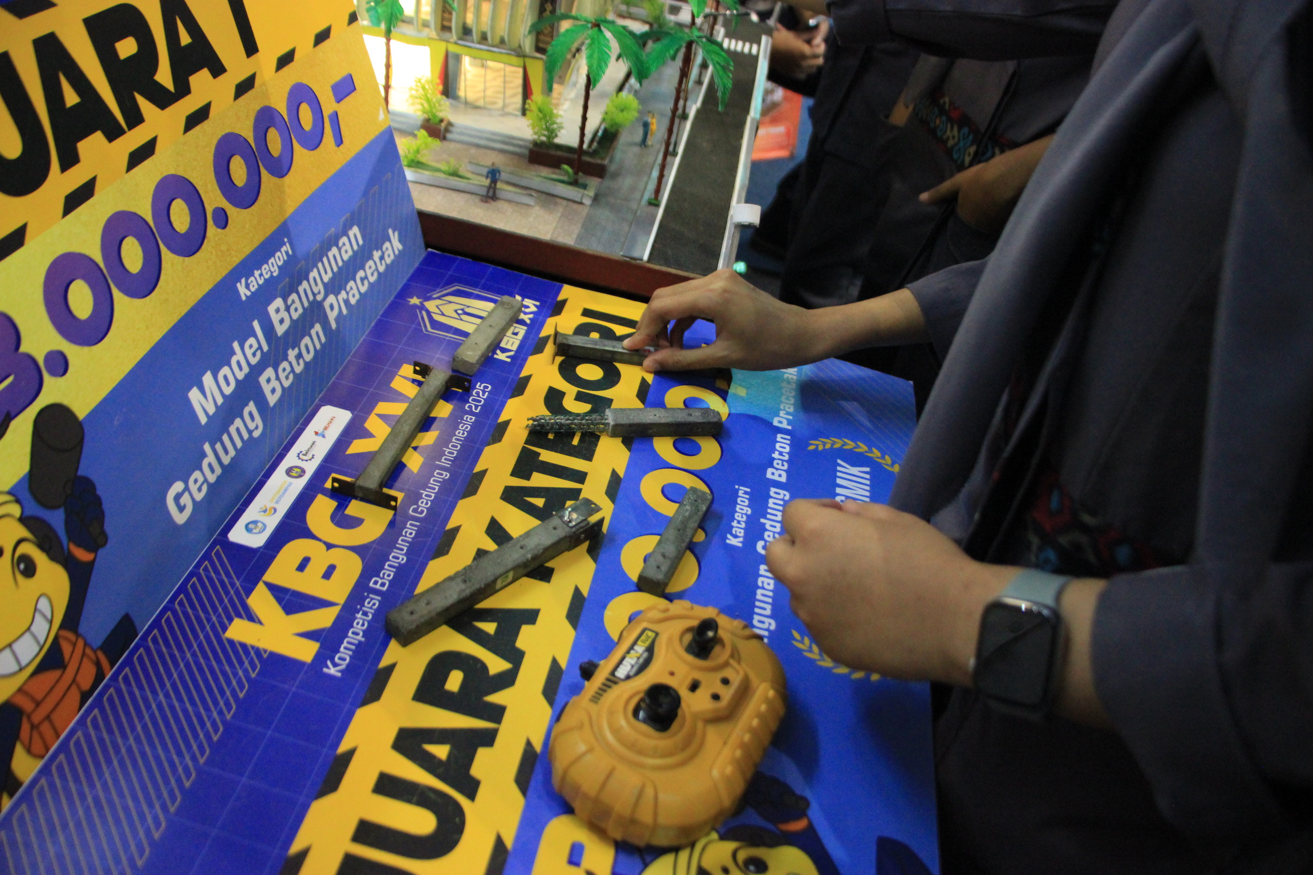“Ini hasil proyek kami untuk lomba KBGI. Hampir semua kampus di Indonesia ikut lomba ini, dan kami membuat gedung skala 1 banding 30 seperti versi aslinya,” jelas Aidil ditemuai Disway Malang di booth-nya.