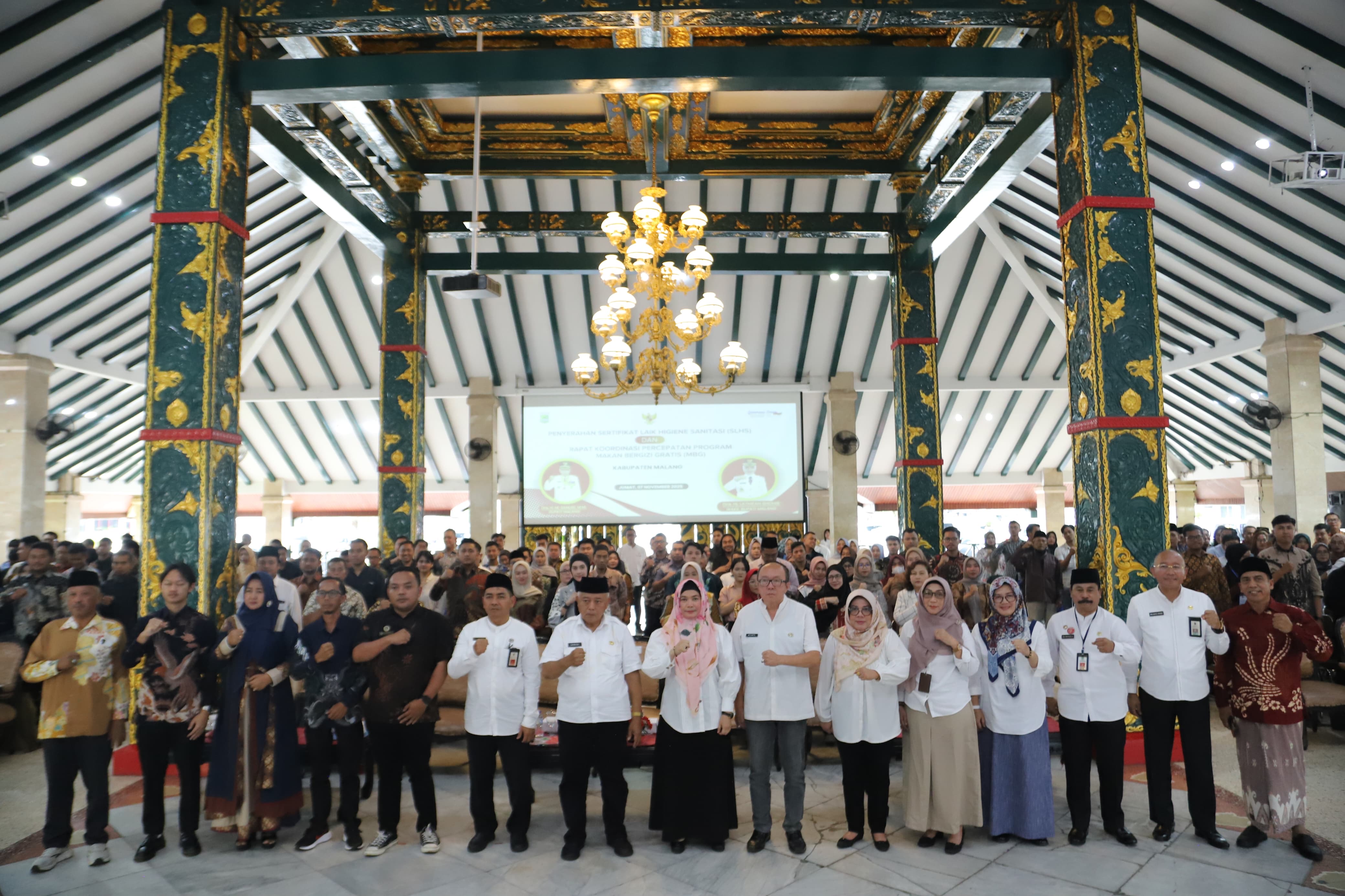 KEPANJEN, DISWAYMALANG.ID- Bupati Malang, M. Sanusi menyerahkan Sertifikat Laik Higiene Sanitasi (SLHS) di Pendopo Agung Kabupaten Malang, Jumat (7/11). Penyerahan sertifikat ini merupakan bagian dari upaya meningkatkan kualitas pelaksanaan program Makan Bergizi Gratis (MBG). Khususnya, dari aspek keamanan pangan.