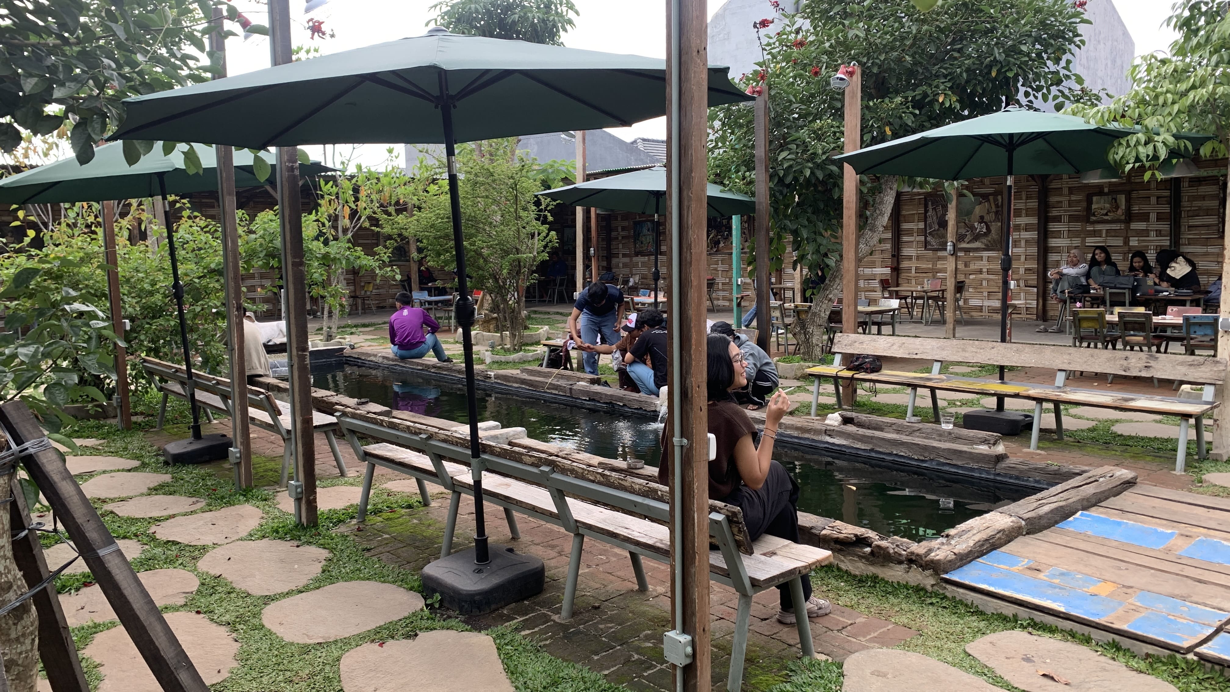 Pantauan di lokasi, Sabtu (13/12), menunjukkan kolam pemancingan berada di area coffee shop dan dapat dimanfaatkan pengunjung untuk mengisi waktu sambil bersantai. Sejumlah tempat duduk disediakan di sekitar kolam agar pengunjung tetap nyaman menikmati suasana kafe.