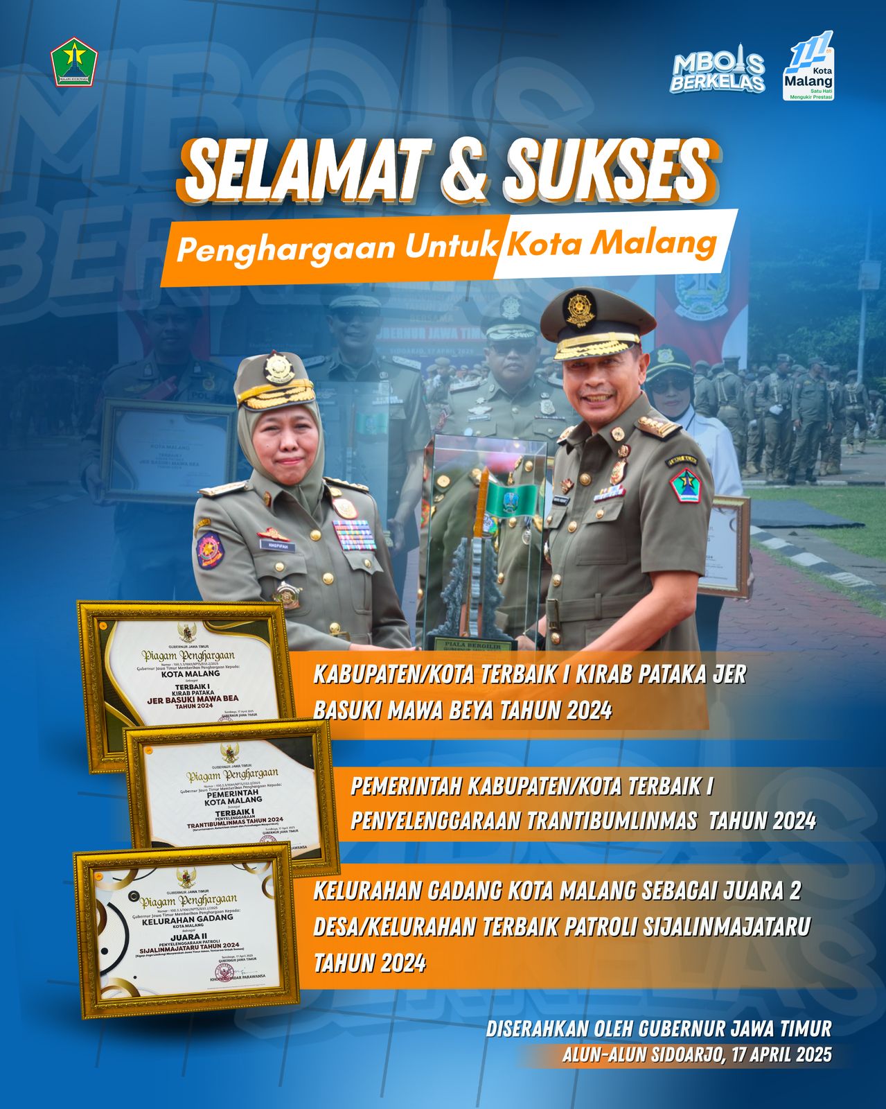 Trantibumlinmas: Penghargaan diberikan atas keberhasilan Kota Malang dalam menyelenggarakan pelayanan keamanan, ketertiban, dan perlindungan masyarakat secara efektif dan terstruktur.