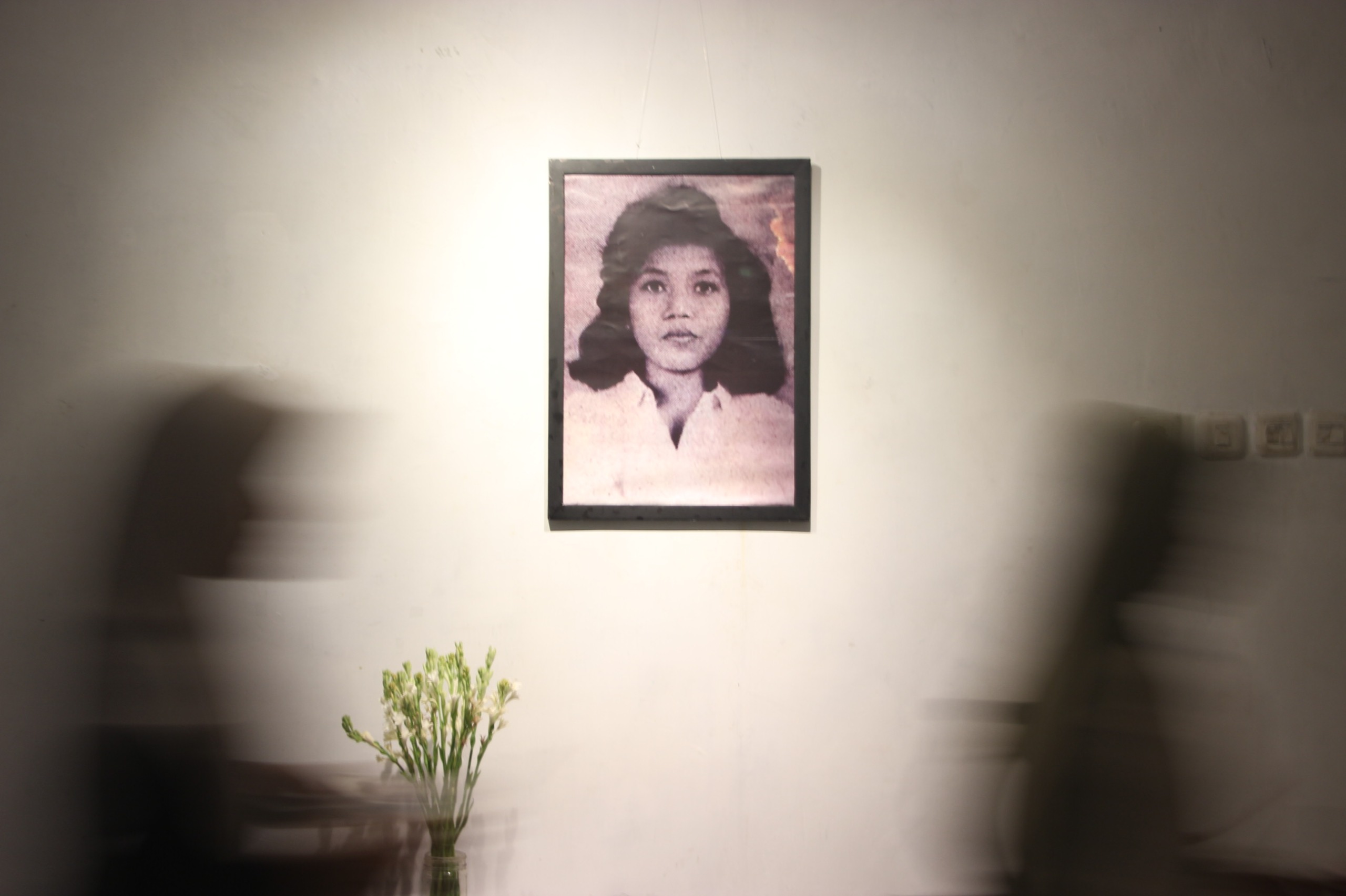 Foto Marsinah yang di tempel pada dinding ruangan pameran disertai dengan bunga sedap malam menambah atmosfer seakan marsinah hadir di tengah-tengah mereka yang sama-sama berjuang, Nocca Coffe, 9 Desember 2025-Martinus Ikrar Raditya-Disway Malang
