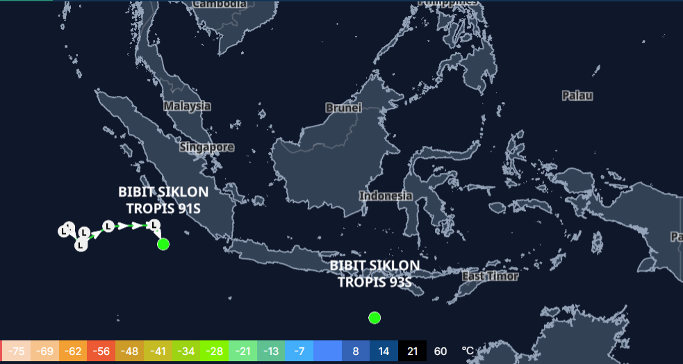 Pergerakan 2 bibit siklon tropis. 91S kini bergerak menjauhi wilayah Indoensia (kiri) sementara 93S relatif stasioner (tidak bergerak) -TCWC Jakarta---