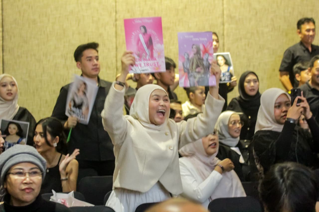 INTAN NIHAYAH begitu bersemangat mendukung finalis jagoannya dalam grand final Puteri Indonesia Jawa Timur 2026 pada Jumat, 19 Desember 2025.-Tirtha Nirwana Sidik-Harian Disway--
