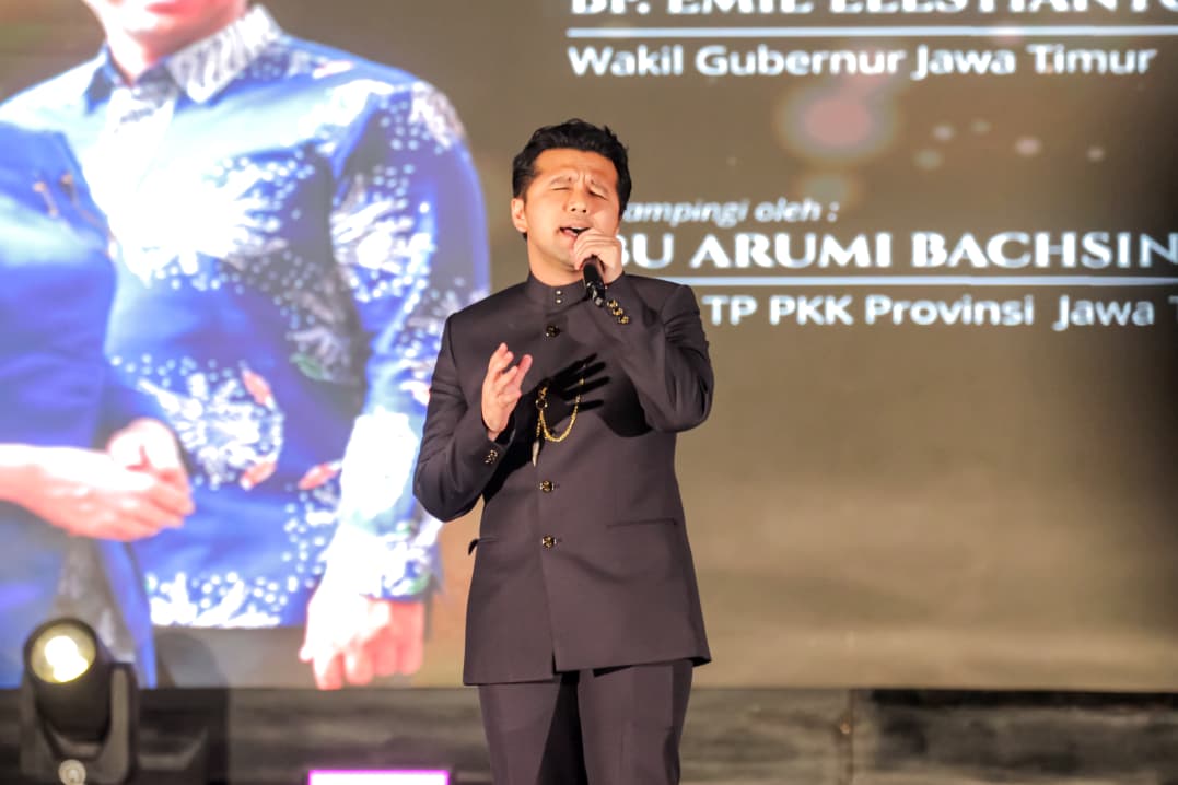 EMIL ELESTIANTO DARDAK, wakil gubernur Jatim, melantunkan “Cantik” dari Kahitna pada malam puncak pemilihan Puteri Indonesia Jawa Timur 2026 pada Jumat, 19 Desember 2025.-Tirtha Nirwana Sidik-Harian Disway--