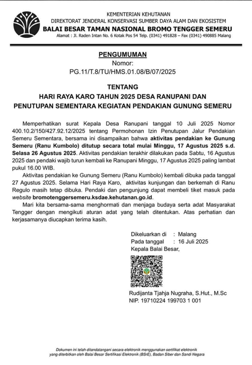 MALANG, DISWAYMALANG.ID – Besar Taman Nasional Bromo Tengger Semeru (BB TNBTS) resmi menutup sementara aktivitas pendakian Gunung Semeru. Penutupan ini berlaku mulai 17 hingga 26 Agustus 2025, dalam rangka perayaan Hari Raya Karo di Desa Ranu Pani, Kecamatan Senduro, Kabupaten Lumajang.