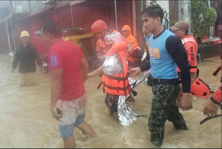 Foto ini diambil pada 9 November 2025 dan dirilis oleh Angkatan Laut Filipina (PCG), menunjukkan personel Angkatan Laut dan polisi mengevakuasi seorang warga di tengah banjir akibat Topan Super Fung-wong di Virac, Provinsi Catanduanes. Hampir satu juta or--