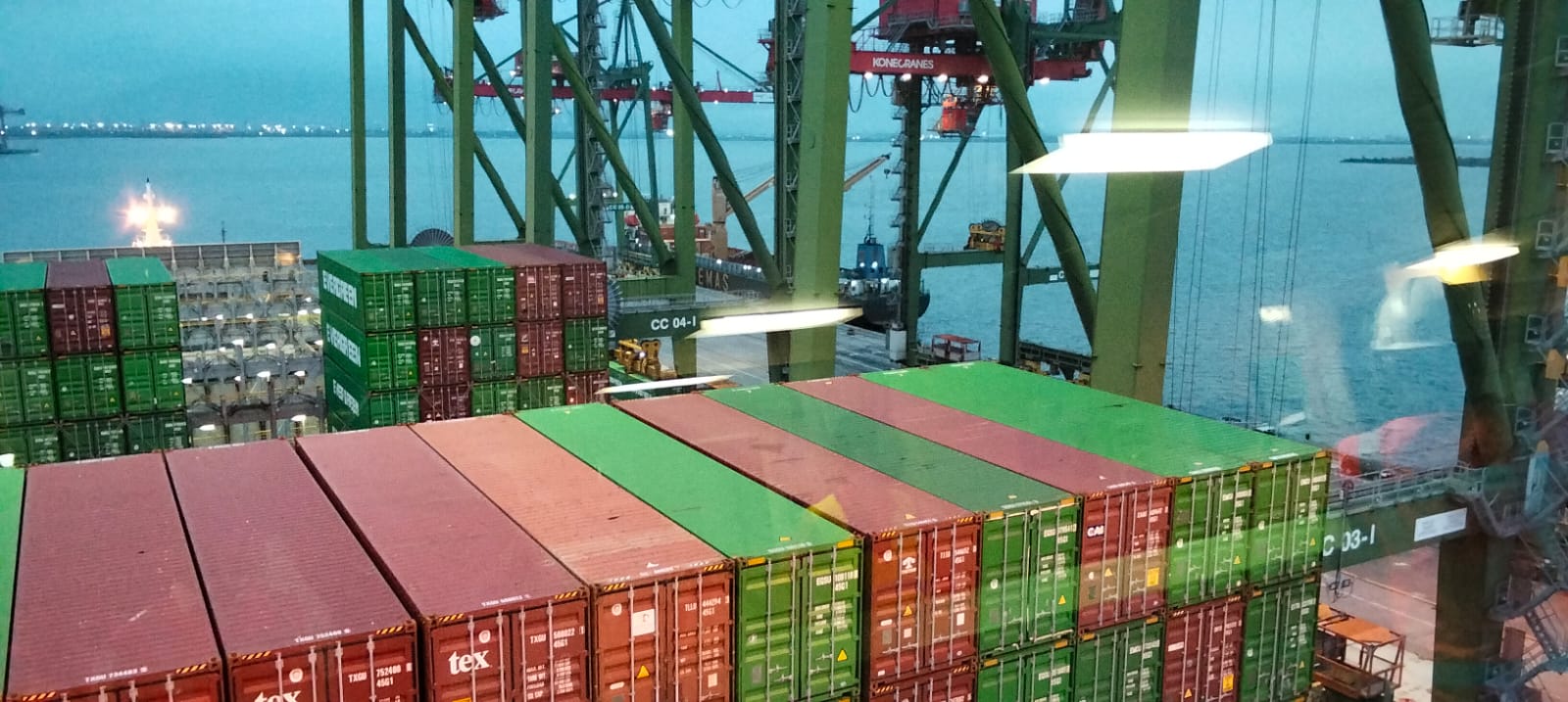 Kapal MV Ital Bonny sedang bongkar muat di dermaga internasional Terminal Teluk Lamong, Surabaya, 19 November 2025.-Foto: Tomy Gutomo-Harian Disway---