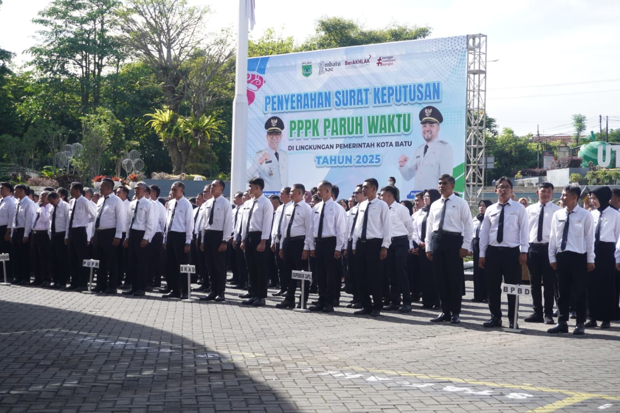 BATU, DISWAYMALANG.ID--Sebanyak 1.233 pegawai Kota Batu menerima Surat Keputusan (SK) Pegawai Pemerintah dengan Perjanjian Kerja (PPPK) Paruh Waktu di halaman Balai Kota Among Tani, Selasa (16/12/2025). Penyerahan SK dilakukan oleh Wali Kota Batu Nurochman secara simbolis dan disaksikan Kepala Kantor Regional II BKN Surabaya, jajaran Forkopimda, serta para kepala SKPD di Pemkot Batu.