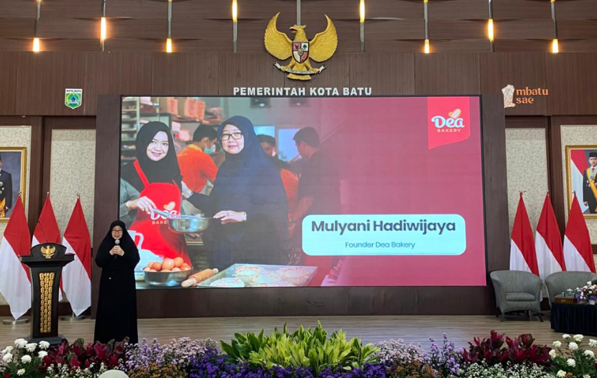 Mulyani Hadiwijaya, founder Dea Bakery, saat talk show di Balai Kota Among Tani Kota Batu, Minggu (12/4/2026), sebagai rangkaian acara Kartini Power Run 2026. -vaura/diswaymalang.id--