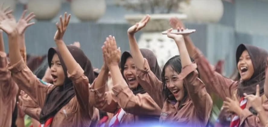 Para pelajar yang tidak tampil menyemangati rekan-rekannya yang tampil. Meski diguyur hujan, mereka tetap semangat--prokopim kota batu