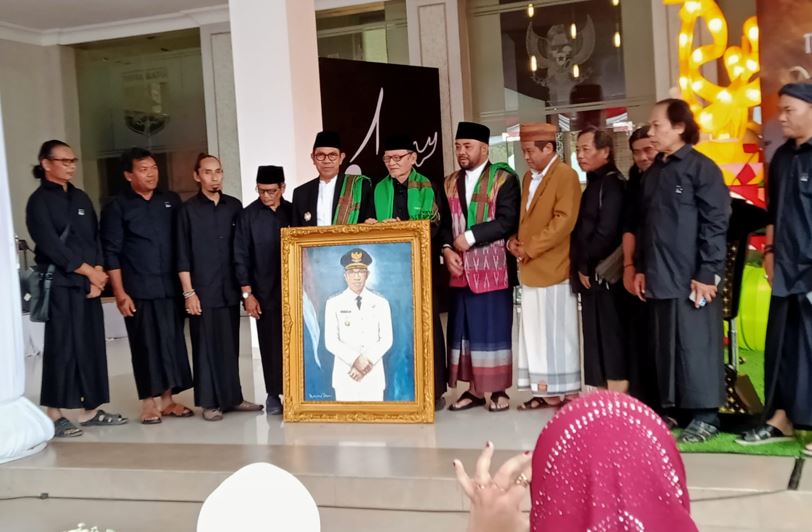 Wali Kota Nurochman (kelima dari kiri) mendapat kado lukisan foto dirinya karya penyair sekaligus perupa KH D. Zawawi Imron (sebelah kanannya). -panca rp/diswaymalang.id--