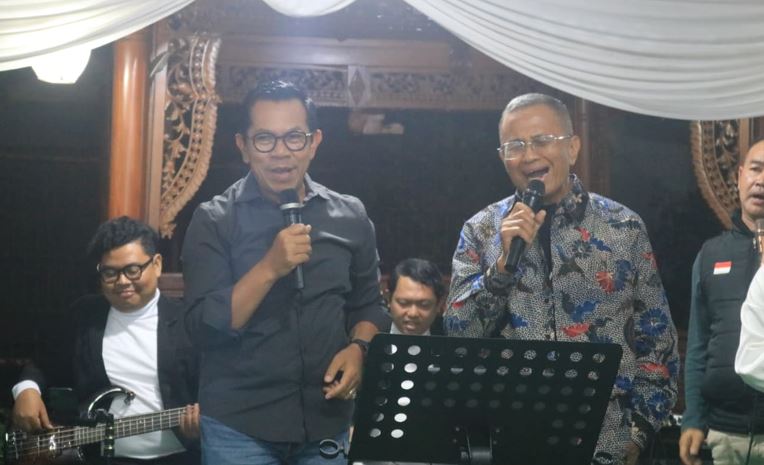 Wali Kota Batu Nurochman dan Dahlan Iskan menyanyi bersama pada acara ramah tamah dan obroln tentang pembangunan Kota Batu di Rumah Dinas Wali Kota Batu, Sabtu malam, 25 Oktober 2025. --panca rp/diswaymalang.id--