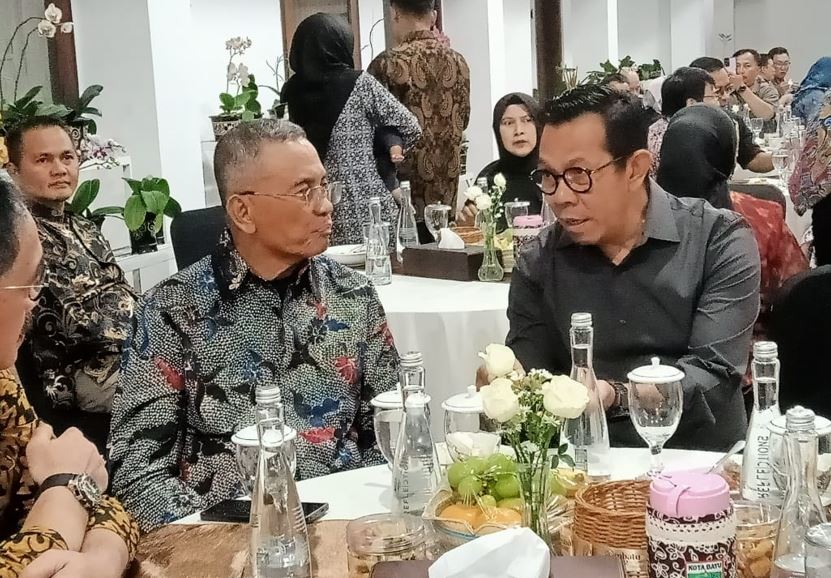 Dahlan Iskan dan Wali Kota Batu Nurochman pada acara ramah tamah sekaligus obrolan tentang pembangunan Kota Batu di Rumah Dinas Wali Kota Batu, Sabtu malam, 25 Oktober 2025. Hadir pula pejabat teras Pemkot Batu. --panca rp/diswaymalang.id--