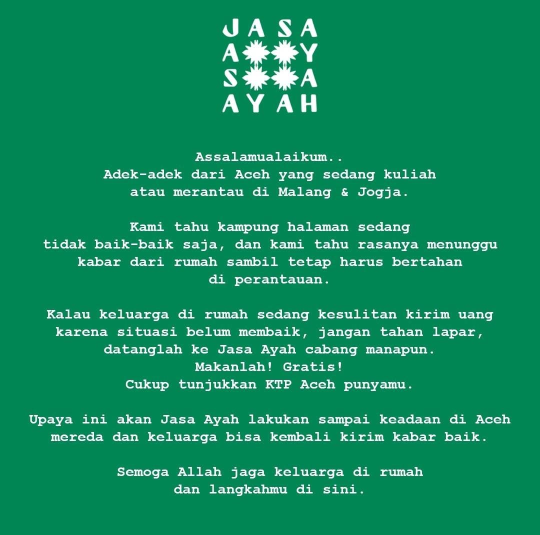 Pernyataan resmi Kedai Jasa Ayah untuk memberikan makan grati bagi mahasiswa aceh--Instagram Jasa Ayah