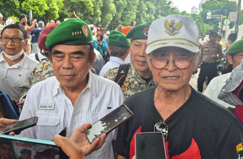 Dalam aksi tersebut, hadir mantan Menteri Agama Fachrur Razi (depan, mengenakan baret hijau, red) yang tergabung dalam Forum Purnawirawan Prajurit TNI. Ia mendesak komisi antirasuah menangkap Jokowi.