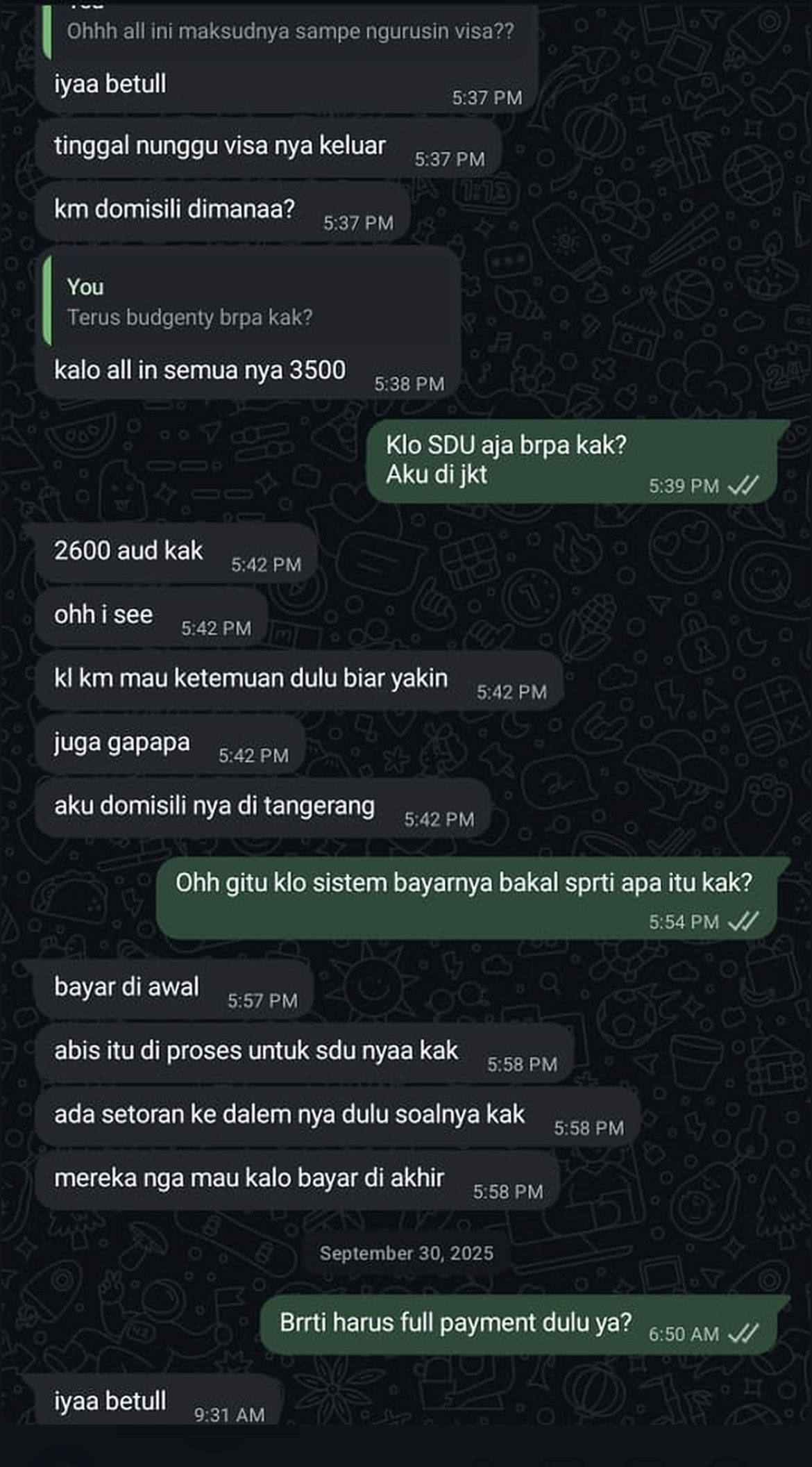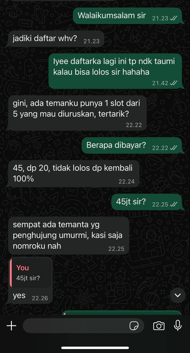 Dialog tentang dugaan jual-beli slot SDU WHV ke Australia tahun 2025 yang dilampirkan dalam petisi kepada Imigrasi. (tangkapan layar WhatsApp) --