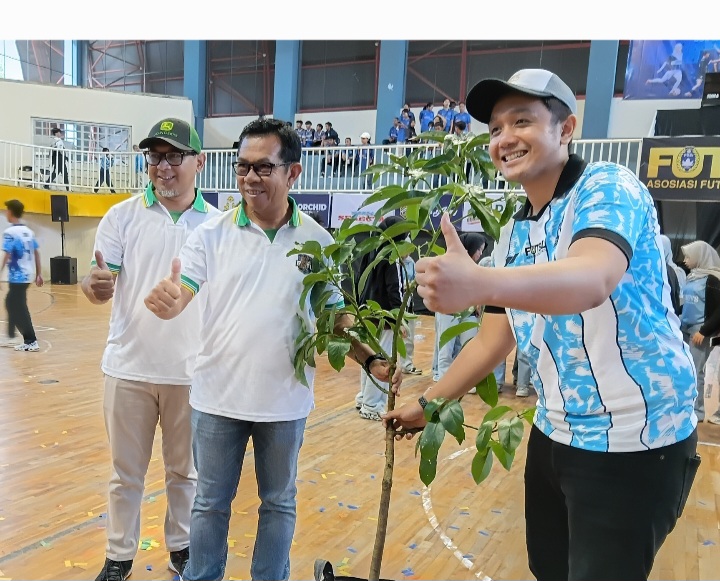 Wali Kota Batu memberikan pohon kepada Ketua Asosiasi Futsal Kota Batu Fahreza pada pembukaan Batu Futsal League 2025 di GOR Gajah Mada Kota Batu, Sabtu (13/11).-panca rp/diswaymalang.id-