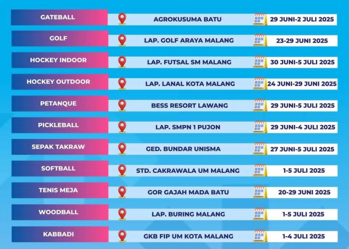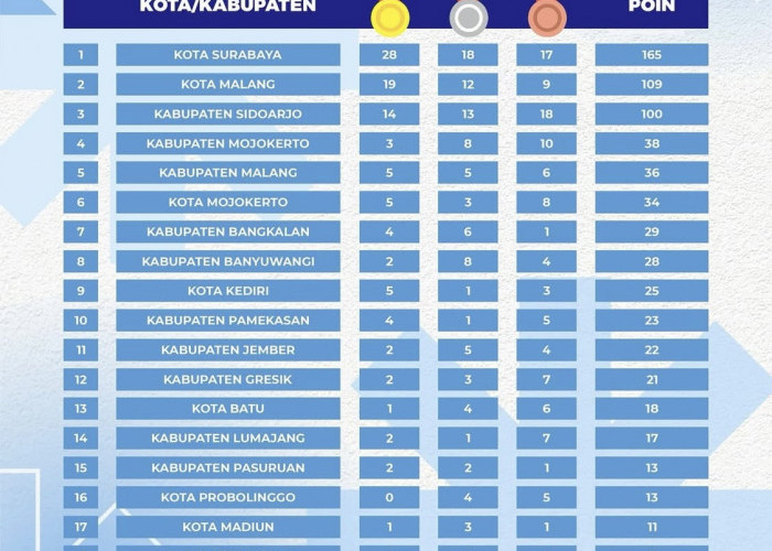 Kabupaten Malang hingga Jumat (4/7) tercatat meraih 45 medali emas, 47 perak, 36 perunggu dengan 350 poin. Dengan hasil itu, Kabupaten Malang sementara ada di posisi 4.