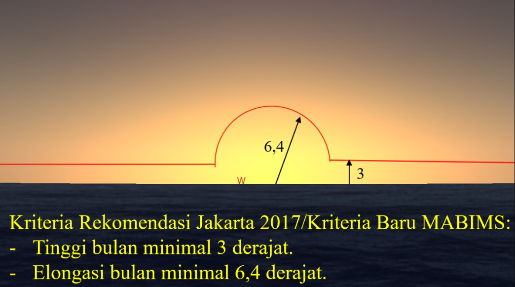 Ilustrasi rekomendasi kriteria MABIMS (3 Derajat) jelang Lebaran 2017. Kriteria ini lebih ketat. Bulan harus punya ketinggian minimal 3 derajat dan elongasi 6,4 derajat. -tdjamaluddin.wordpress.com--