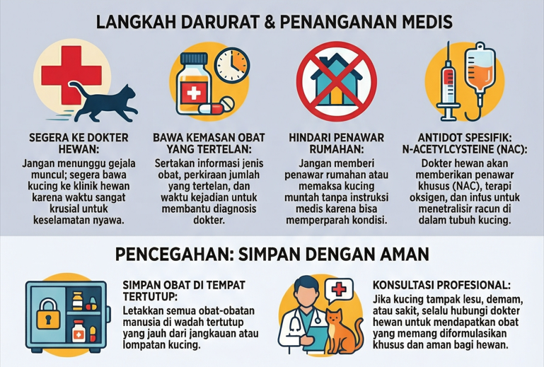 Jika kucing tertelan paracetamol, anggap itu darurat. Segera hubungi dokter hewan atau klinik darurat. Jangan menunggu gejala muncul. Catat jenis obat, perkiraan jumlah, dan waktu tertelan. Bawa kemasan obat ke klinik agar dokter bisa mengambil keputusan cepat.