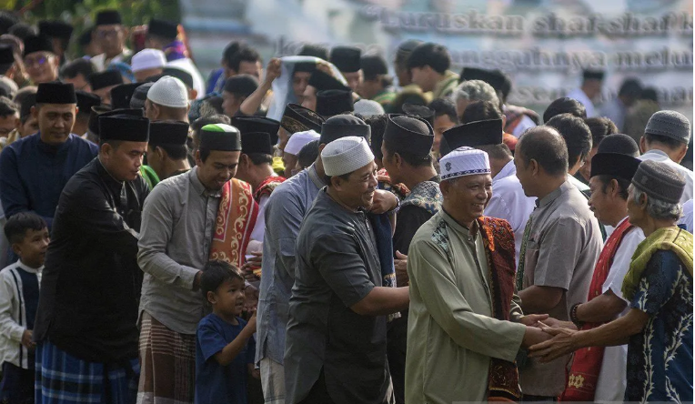 Ilustrasi halal bihalal usai Salat Idulfitri. Umat Islam saling memberi maaf. Mereka terbebas dari dosa personal kepada Allah Swt dan dosa sosial kepada sesama manusia. -antara--