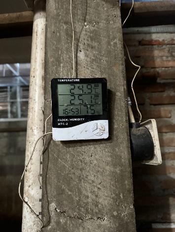 Sedangkan di bagian dalam panel, terdapat sensor suhu dan kelembapan yang terpasang dengan menggunakan teknologi IoT sehingga dapat dipantau dari jarak jauh menggunakan ponsel. Aplikasi yang digunakan tidak hanya menampilkan grafik suhu dan kelembapan tetapi juga dapat digunakan untuk mengontrol nyala dan mati kipas serta cooling pad. Selain itu juga dapat memberikan notifikasi ketika terjadi pemadaman listrik sehingga kondisi kandang akan tetap terpantau dengan baik.