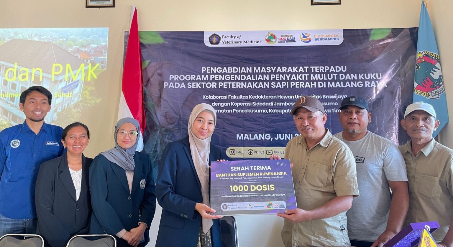 Salah satu kegiatan pengabdian masyarakat Fakultas Kedokteran Hewan UB, berupa penyerahan bantuan suplemen untuk ternak ruminansia dalam rangka pencegahan penyakit mulut dan kuku--fkh.ub.ac.id