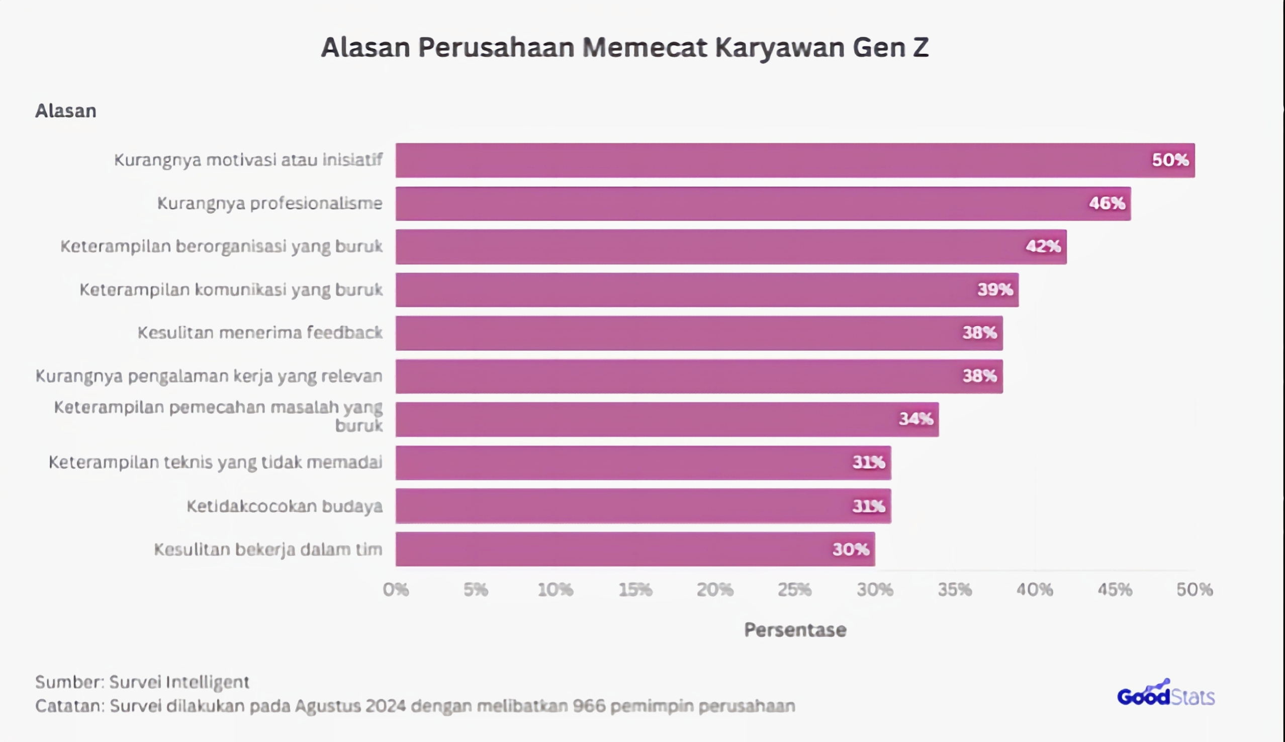 Menurut survei yang dilakukan oleh Intelligent pada Agustus 2024 terhadap 966 pemimpin perusahaan, ada beberapa faktor utama yang menyebabkan karyawan Gen Z diberhentikan.