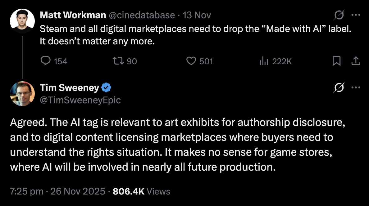 Kontroversi ini semakin membesar karena muncul hanya beberapa minggu setelah CEO Epic Games, Tim Sweeney, menyatakan bahwa label AI-generated pada aset gim sebaiknya dihapus. Menurutnya, AI akan menjadi bagian alami dari proses produksi.